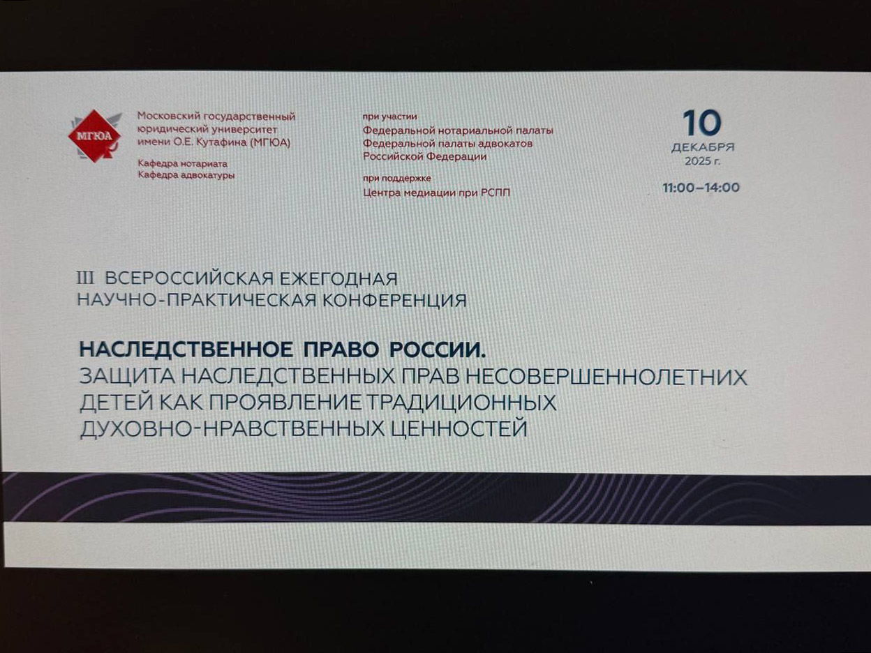 10 декабря 2025 года вице-президент Нотариальной палаты города Севастополя Максим Юрченко принял участие в III Всероссийской научно-практической конференции «Наследственное право России. Защита наследственных прав несовершеннолетних детей как проявление защиты традиционных духовно-нравственных ценностей» в дистанционном формате. Организаторами мероприятия выступили кафедра нотариата Московского государственного юридического университет имени О.Е. Кутафина (МГЮА);Федеральная нотариальная палата; кафедра адвокатуры Московского государственного юридического университет имени О.Е. Кутафина (МГЮА); Федеральная палата адвокатов Российской Федерации; Центр медиации при РСПП.